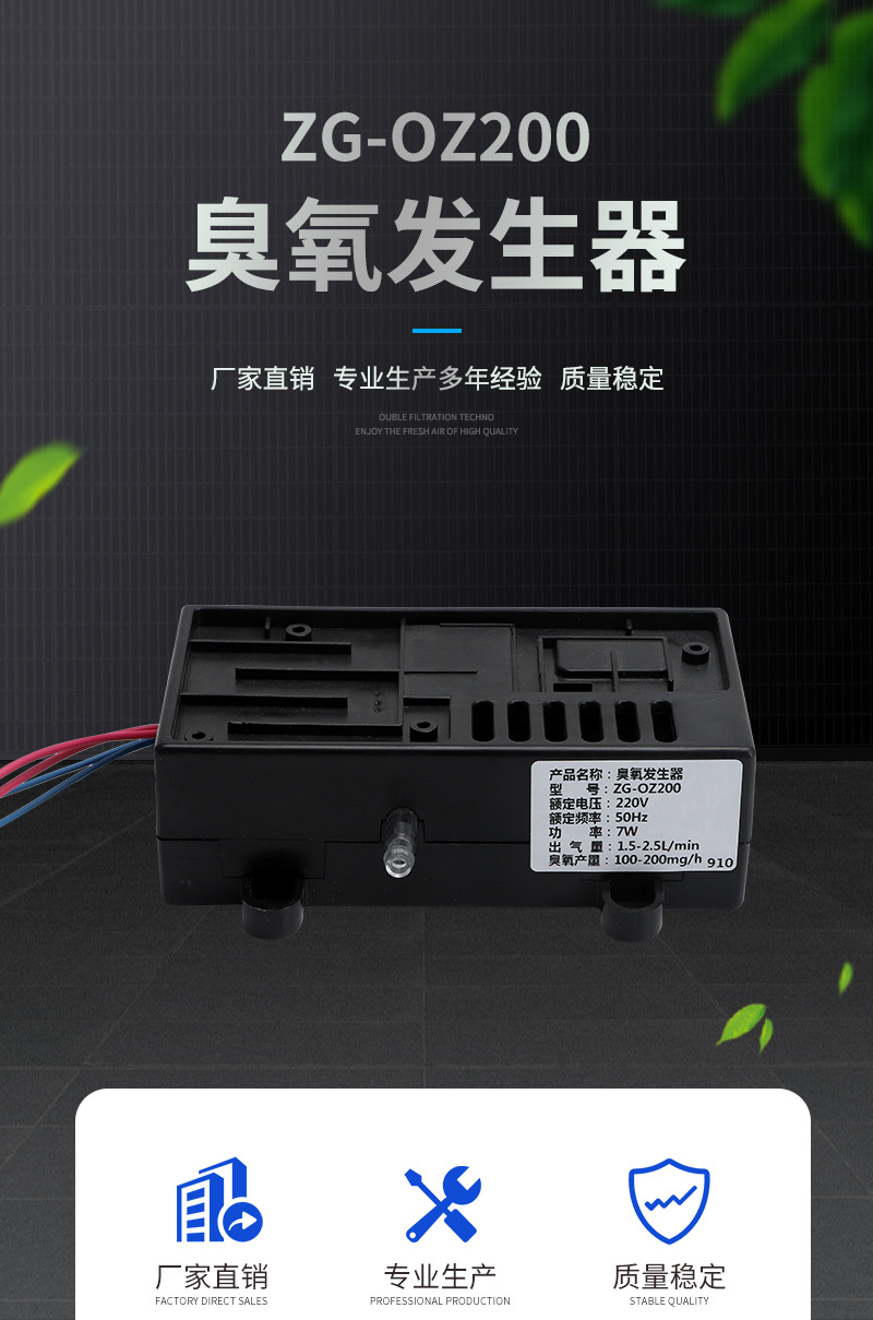 ZG-OZ200小型臭氧發生器采用最新的臭氧核心放電體,包括臭氧發生管、臭氧驅動電路和氣泵的一體化設計,只要接上電源即可提供高效穩定的臭氧輸出,安裝使用維護方便。