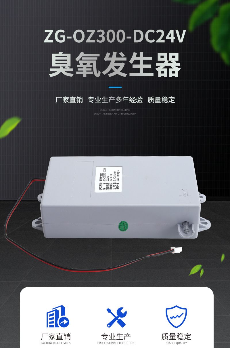 ZG-OZ300-DC24V小型臭氧發生器采用最新的臭氧核心放電體,包括臭氧發生管、臭氧驅動電路和氣泵的一體化設計,只要接上電源即可提供高效穩定的臭氧輸出,安裝使用維護方便。